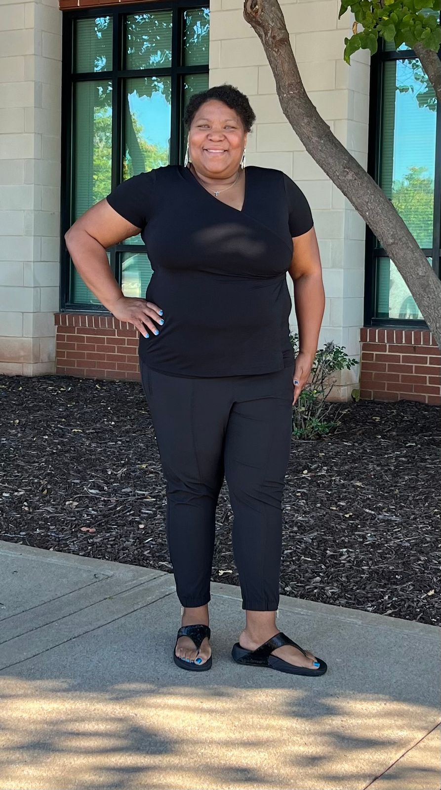 Thank you for your review, Theresa! We're thrilled to hear how perfectly the Wrap fits and flatters you. It's so great to know that the design elements work exactly as intended - from the V-neck to the front panel placement. We appreciate you sharing such detailed feedback about the sizing and fit experience :)